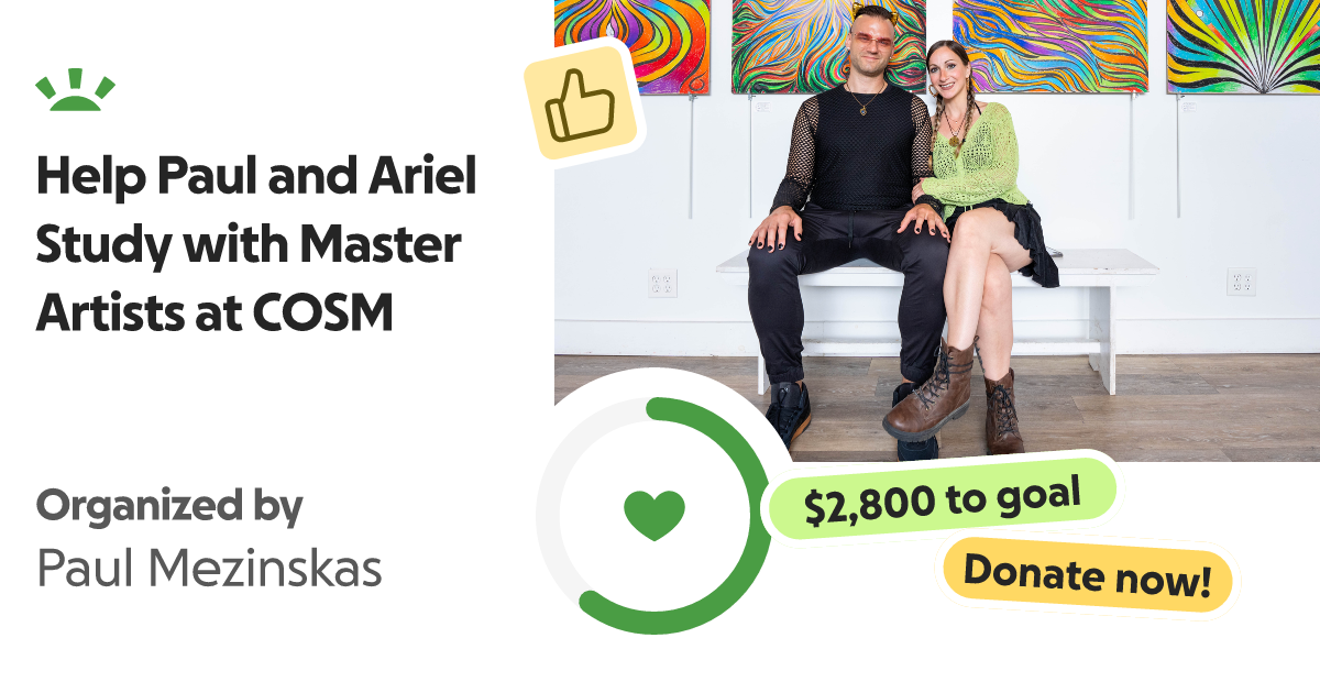 Paul and Ariel had the great pleasure of being accepted into the visionary intensive to learn and study with 2 of their favorite artists, and are asking the community to help raise funds for the cost of the class, meals and lodging for the week. The collective total of admittance is $2,800. Any funds raised would help them study under the tutelage of master artists, Alex and Allyson Grey. Help them reach their creative dreams by supporting their journey!